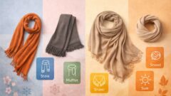 関連アイテムで混同しやすいのが、マフラーとスヌード。マフラーは冬の首元防寒に特化した細身が多く、スヌードは輪になっていて着脱がラク。ストールはその中間で、アレンジ自由度が高いのが魅力です。